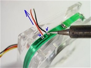 | Så tager du lode koblen og lodder de to tilbage værende ledninger som sidder på LED printet. Være forsigtig at ikke varme/brænde printet for meget.  |